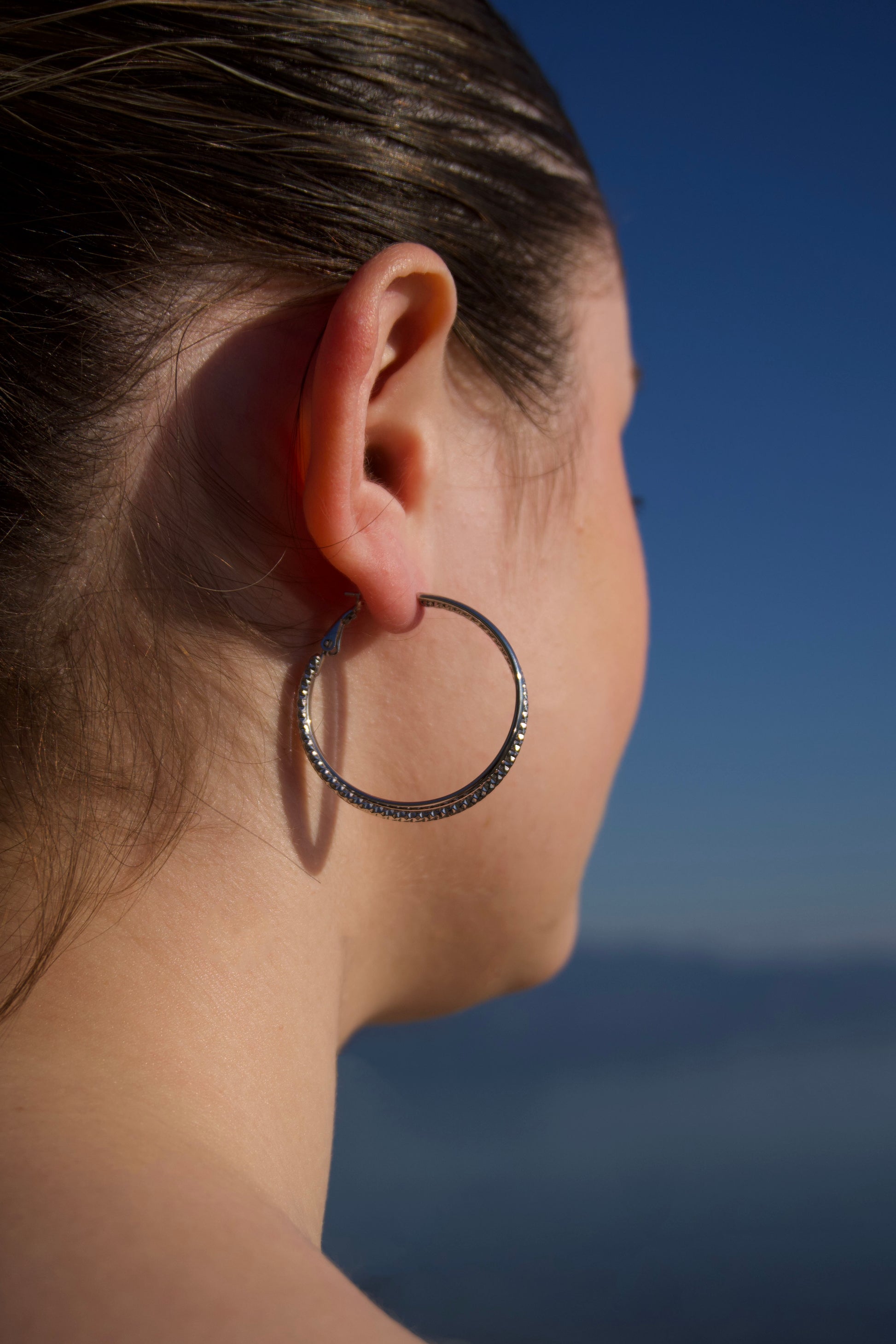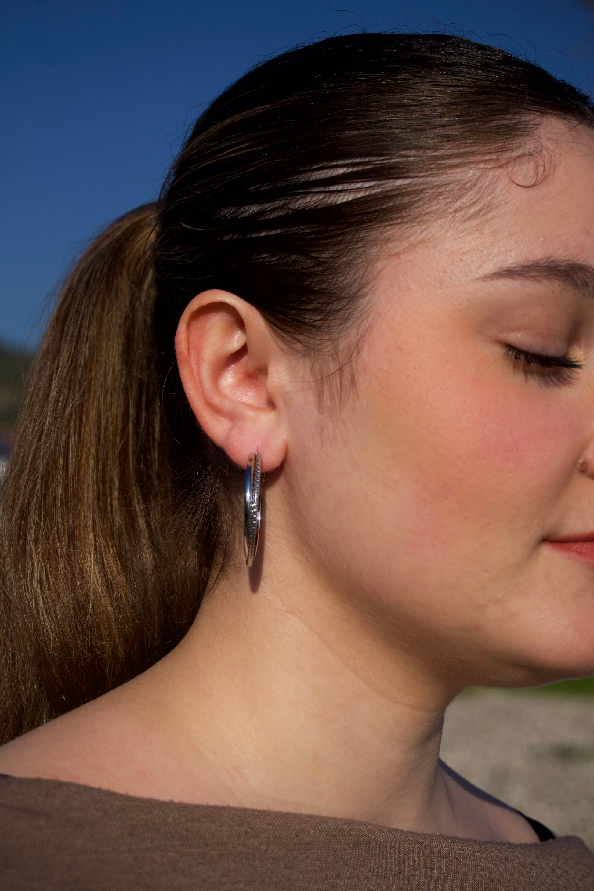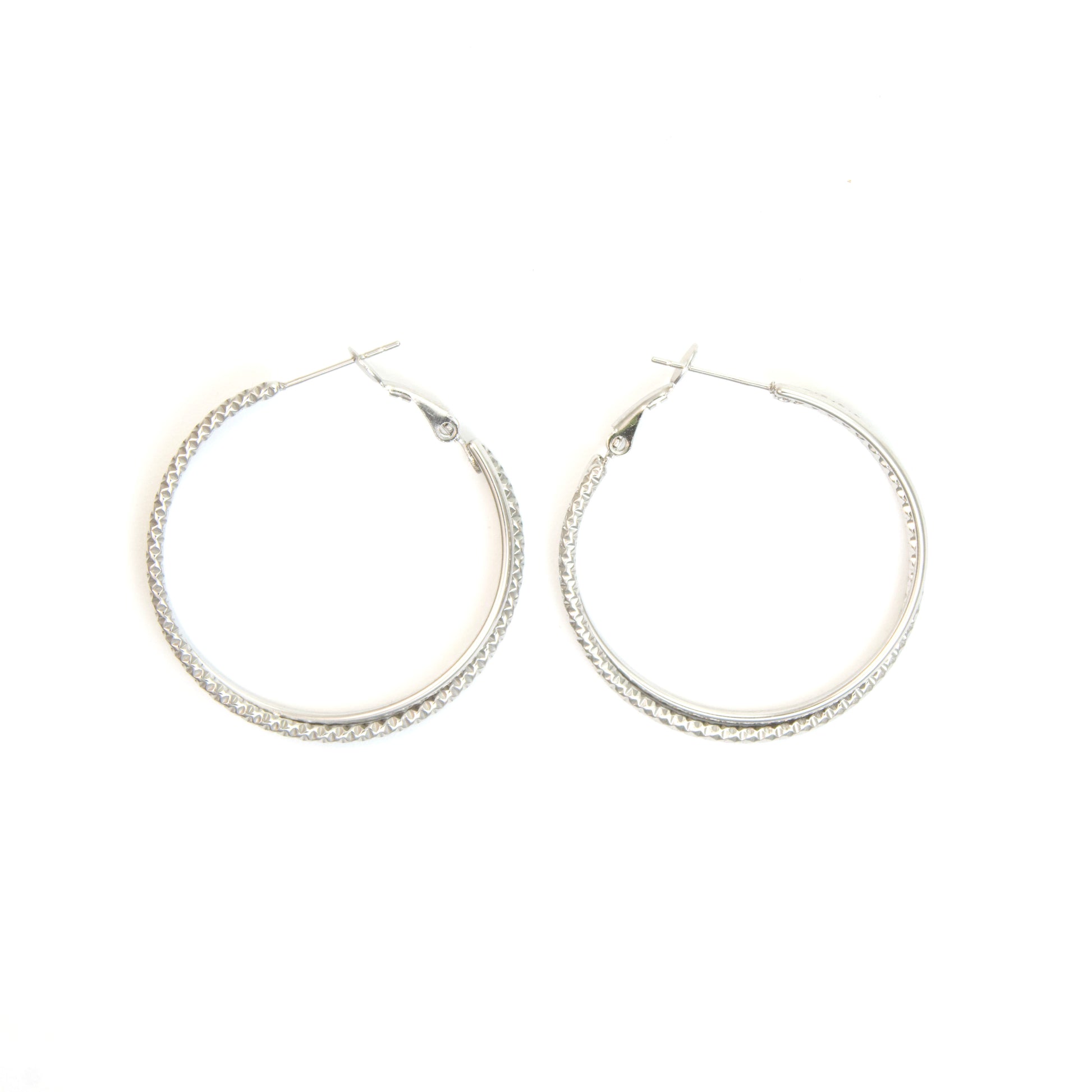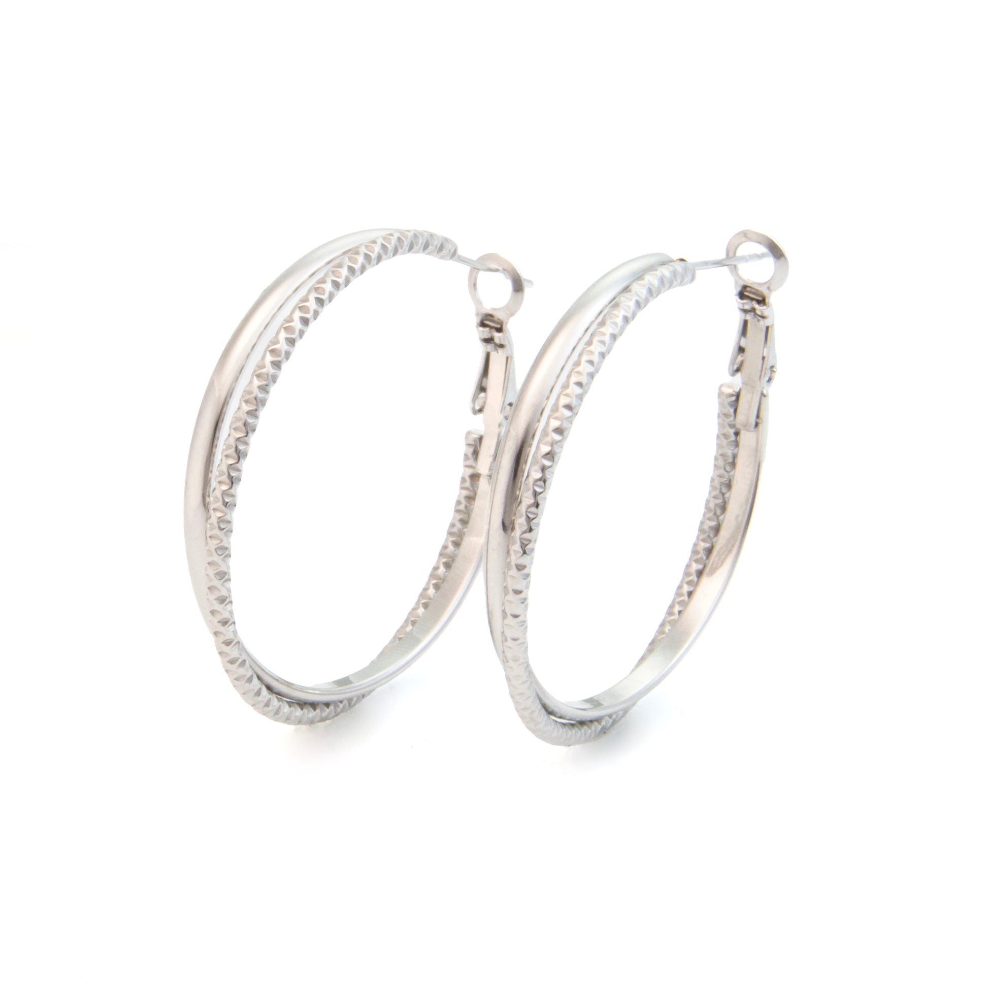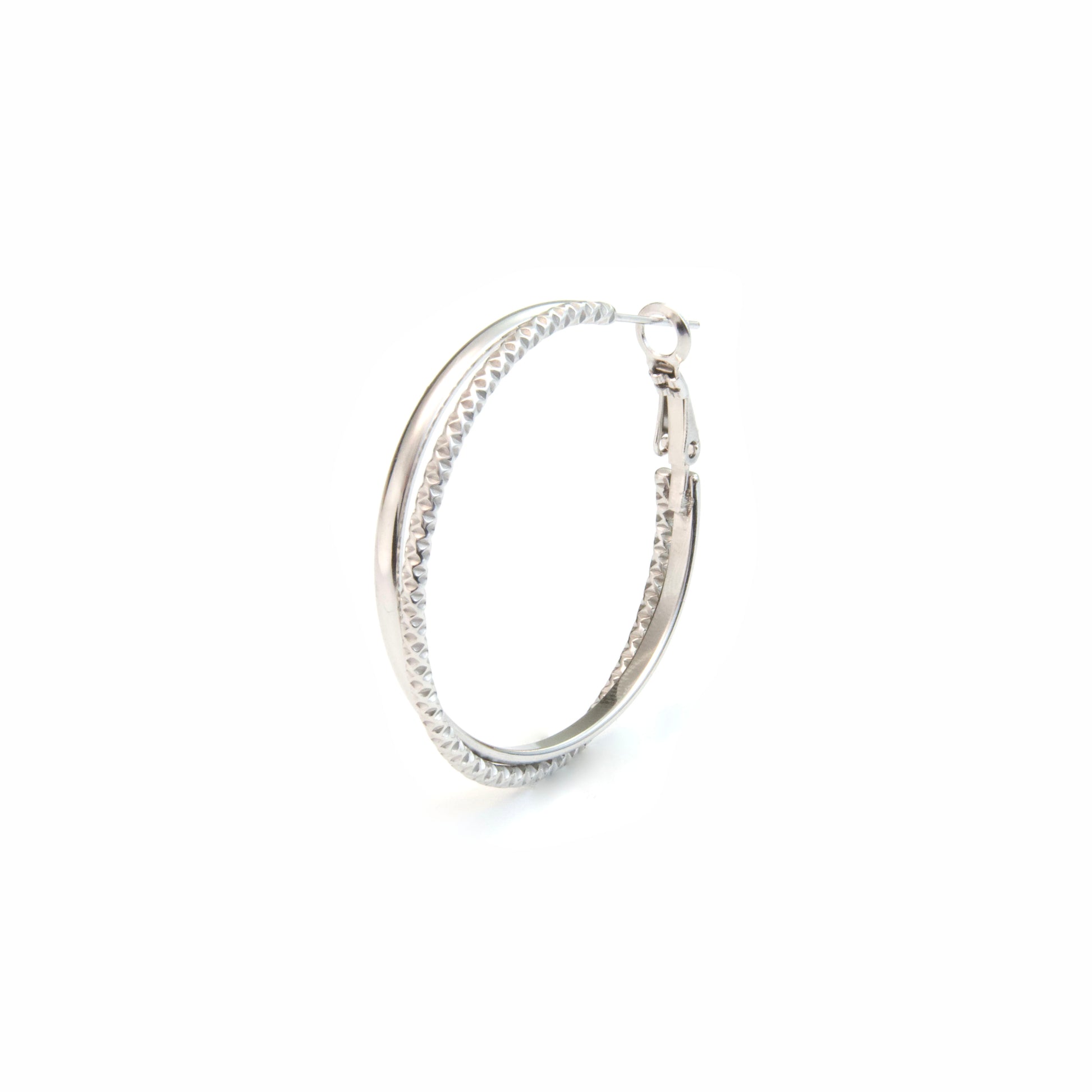 Double hoop with a smooth and a textured hoop combined. Available in Silver color.